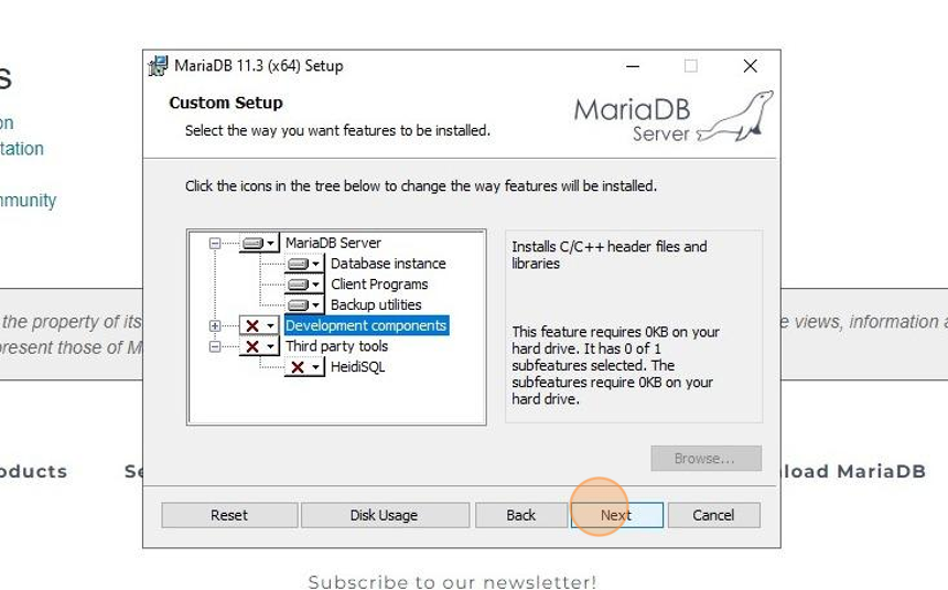 6. Set "Third party tools" and "Development components" to "Entire feature will be unavailable", then click "Next"